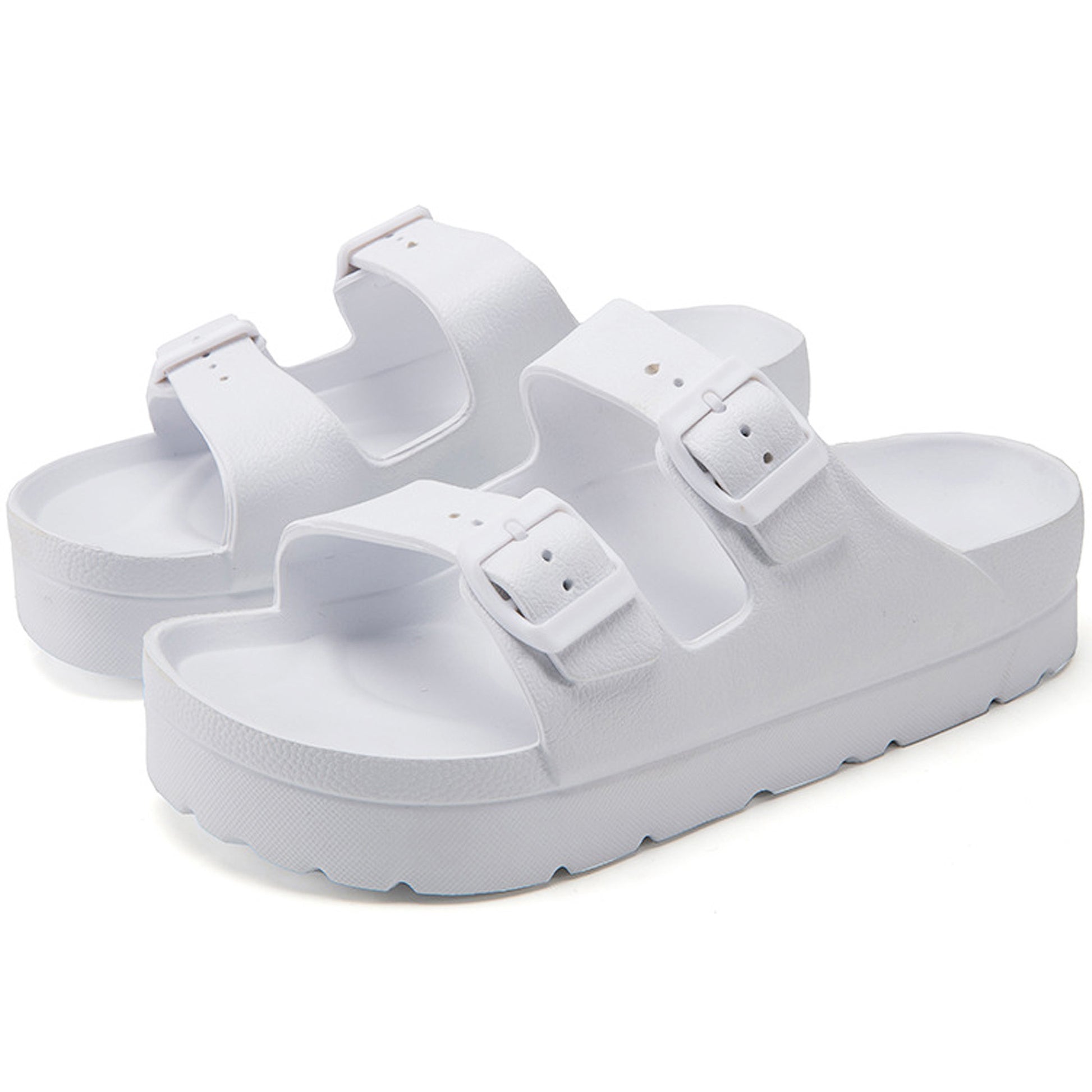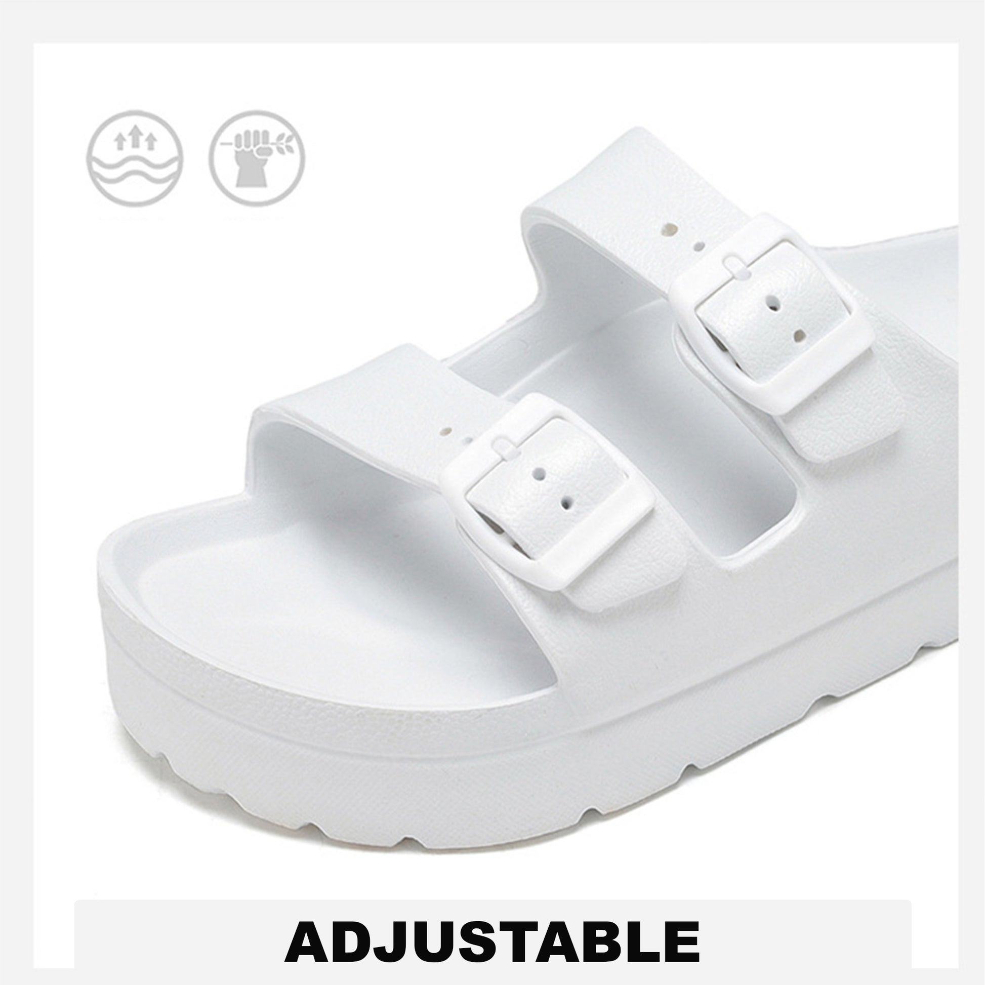 Upgrade your wardrobe with the cool and casual look of Women's Double Buckle Platform Slide Sandals. These double strap sandals are made from a cushioned rubber material with a low 1" platform wedge. Its slip on design provides quick and easy wear wherever you go, and the no-heel construction allows you to comfortably dress them up or down, day to evening! Match them with all your favorites, from flowy dresses to denim shorts and jumpsuits!