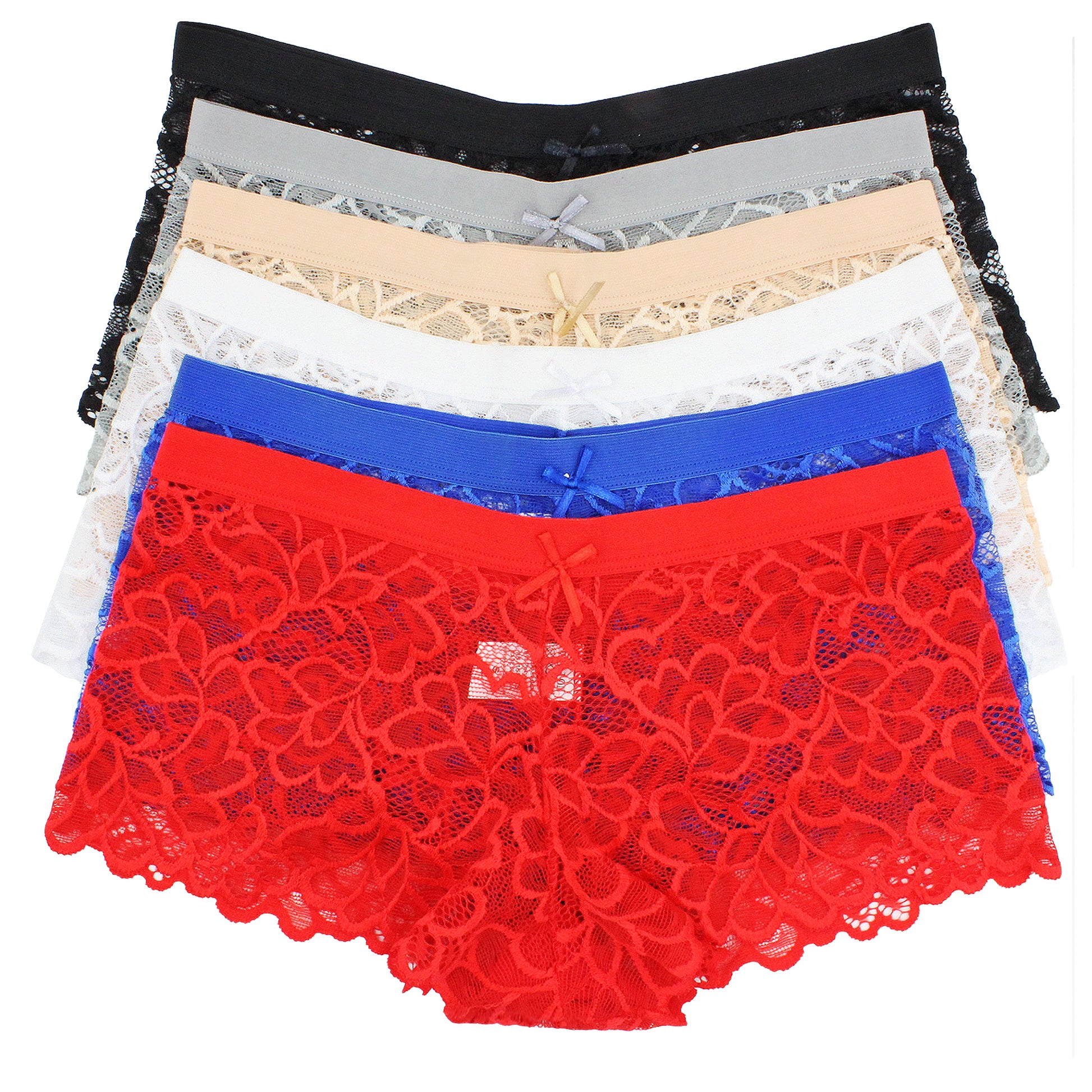 You'll feel as good as you look in LAVRA Womens 6 Pack of Lace Boyshorts Floral Thong Sexy Panties Underwear! These classicly tailored multipack underwear sets provide ultimate comfort with a nylon blend lace construction that offers a lightweight feel and feminine touch. The minimal design is perfect for form-fitting garments from leggings to denim jeans and fitted dresses. Available in a variety of colors, so you're guaranteed to find a set you love!
